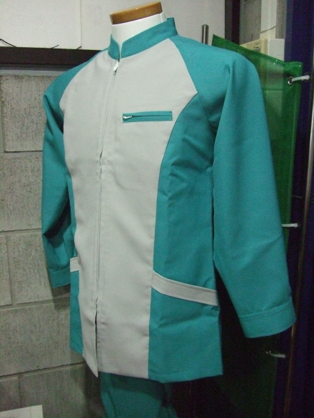 スタンドカラーのカチットタイプ。 ミントグリーンとグレーの配色で 涼しさを演出しています。